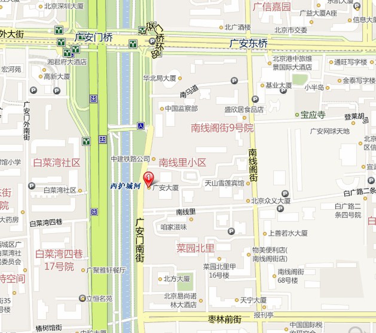 3、從南向北走:南二環至西二環白紙坊橋出口出去,往東(右轉),第一個紅綠燈往北(左轉),沿河邊一直往北走,北方工業公司向北200米,馬路右邊廣安大廈即到。